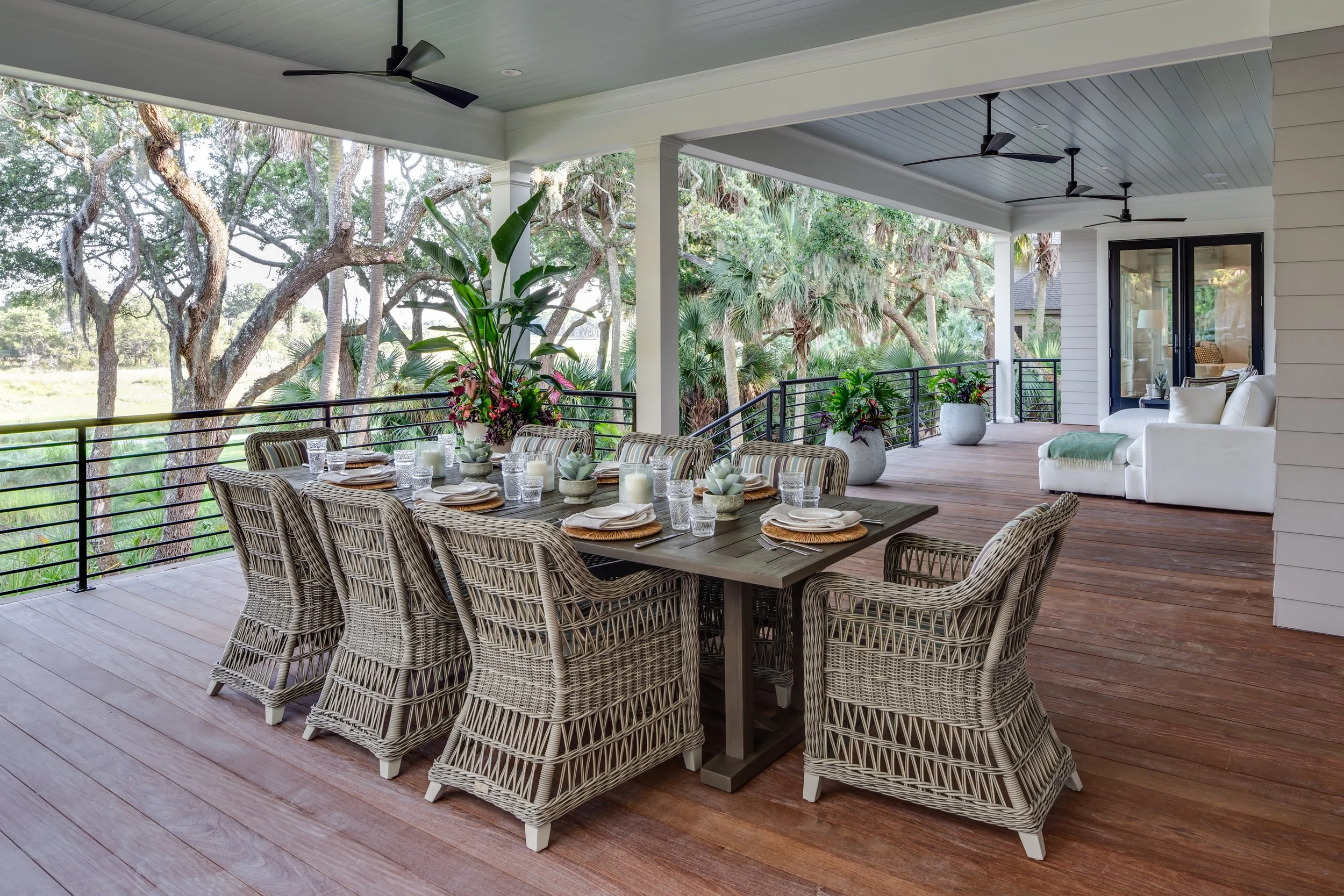 Synergy, defined as conditions where the collective effect surpasses the sum of individual components, can essentially be equated to balance. This equilibrium is found in the alignment of the sofa upon which we recline and our experience as we sit. It's evident in the harmony between the dining area where we partake of our meals and the colors that envelop us during our repast. Synergy extends to the chaise lounge where we seek respite for our minds and the artwork adorning the walls as we rest our thoughts. The pinnacle of balance is reached when synergism is attained: all these furnishings coexist harmoniously in a space infused with the beauty of nature. The myriad shades of green in the home mirror the trees and foliage beyond the windows, while the yellows, tans, and ochre of the fabrics find their echo in the saw grass marsh stretching beyond the trees. Similarly, the blues and teals of the accessories and artwork find their reflection in the distant lake.
